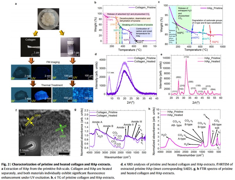 將魚(yú)鱗處理分離成膠原蛋白和HAp(羥基磷灰石),分別加熱,均可在熒光顯微鏡下觀察到熒光增強(qiáng)。使用XRD和FTIR等技術(shù)分析,結(jié)合電鏡成像,可以判斷加熱后的魚(yú)鱗發(fā)生了結(jié)構(gòu)變化和化學(xué)反應(yīng),形成多孔結(jié)構(gòu)和新的成分,多方面因素最終提升了紫外吸收和熒光強(qiáng)度。