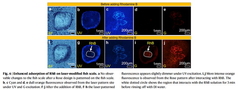 這篇論文的核心發(fā)現(xiàn)有兩個(gè),就是通過(guò)加熱魚(yú)鱗可以改變魚(yú)鱗的熒光特性和物理特性,熒光特性可以用作隱寫(xiě)信息實(shí)現(xiàn)防偽等功能;物理特性可以吸收水體羅丹明B污染物,其吸收較快且制造工藝簡(jiǎn)單,有取代活性炭的潛力。