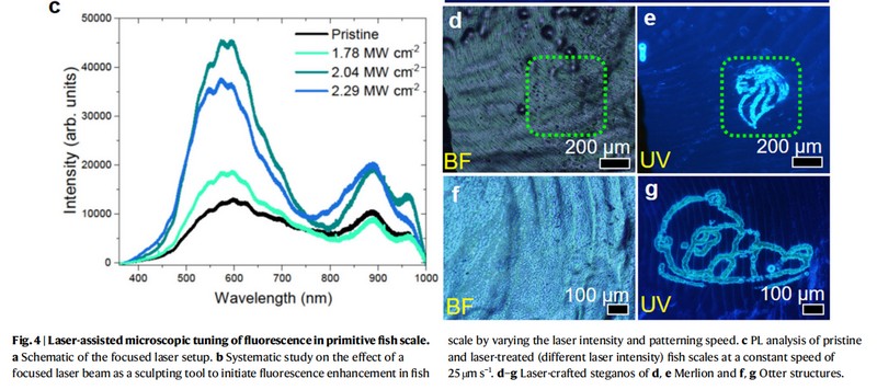 利用這個(gè)設(shè)置,研究人員成功在魚(yú)鱗上刻上了隱寫(xiě)的魚(yú)尾獅和水獺的圖案,這個(gè)圖案在明場(chǎng)下不可見(jiàn),只有使用紫外激發(fā)才能看到,實(shí)現(xiàn)類似防偽油墨的效果,但不會(huì)造成防偽油墨的污染,加工工藝也難以模仿。