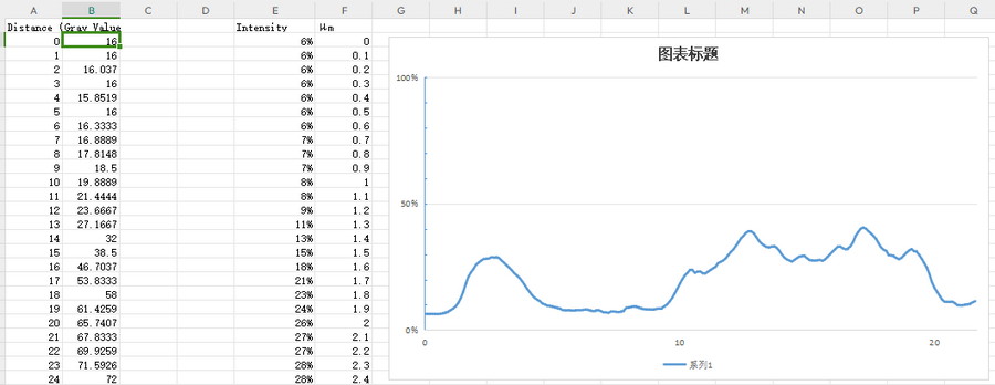 一個(gè)小提醒,如果想在Excel里做出像上面論文的圖片,可能還需要經(jīng)過(guò)數(shù)據(jù)處理,前列是像素,需要根據(jù)軟件標(biāo)尺換算成尺寸,通常是μm;后列是熒光強(qiáng)度,因?yàn)閿?shù)據(jù)是8bit的,因此數(shù)值是0-255,按255為100%做個(gè)換算來(lái)畫(huà)Y軸。
