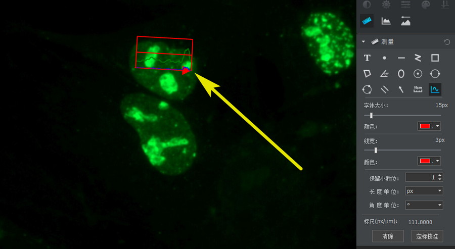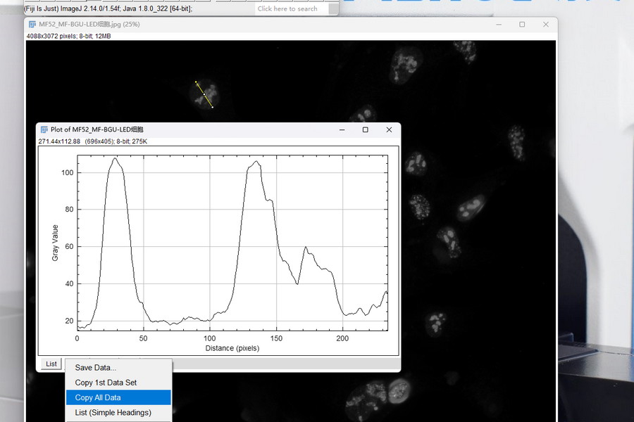 能量曲線(xiàn)方便易用,直觀快速但不夠量化,要更量化地進(jìn)行徑向熒光強(qiáng)度分析,需要用到ImageJ或者說(shuō)FIJI(JIFI是更新版的ImageJ).首先打開(kāi)熒光圖片,使用直線(xiàn)工具畫(huà)線(xiàn),注意畫(huà)線(xiàn)對(duì)比時(shí)長(zhǎng)度數(shù)據(jù)要一致。