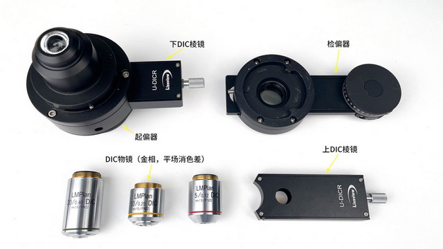最初的DIC顯微鏡是由偏光顯微鏡改造而成的,因此偏光顯微鏡的一些核心配件也是DIC顯微鏡的核心配件,包括起偏器、檢偏器、無應(yīng)力物鏡,以及DIC核心配件,帶滑動器DIC棱鏡。特殊配置可能還有de sénarmont補(bǔ)償器等配件,基本思路類似偏光顯微鏡的補(bǔ)償器,可以調(diào)整增強(qiáng)透明樣品效果,這里不作討論。