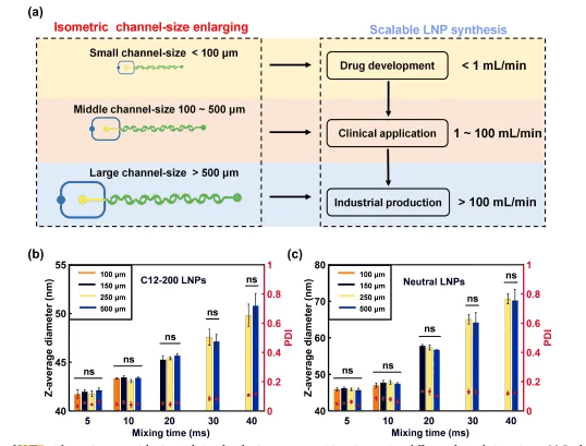 在這項(xiàng)研究中,研究人員提出了一種通過等比例擴(kuò)大慣性微流控混合器的三維通道尺寸來實(shí)現(xiàn) LNPs 可擴(kuò)展合成的方法。他們?cè)O(shè)計(jì)了一種高效的慣性流混合器,并通過理論預(yù)測(cè)方法,確保在不同芯片上合成的 LNPs 具有一致的粒徑和粒徑分布。
