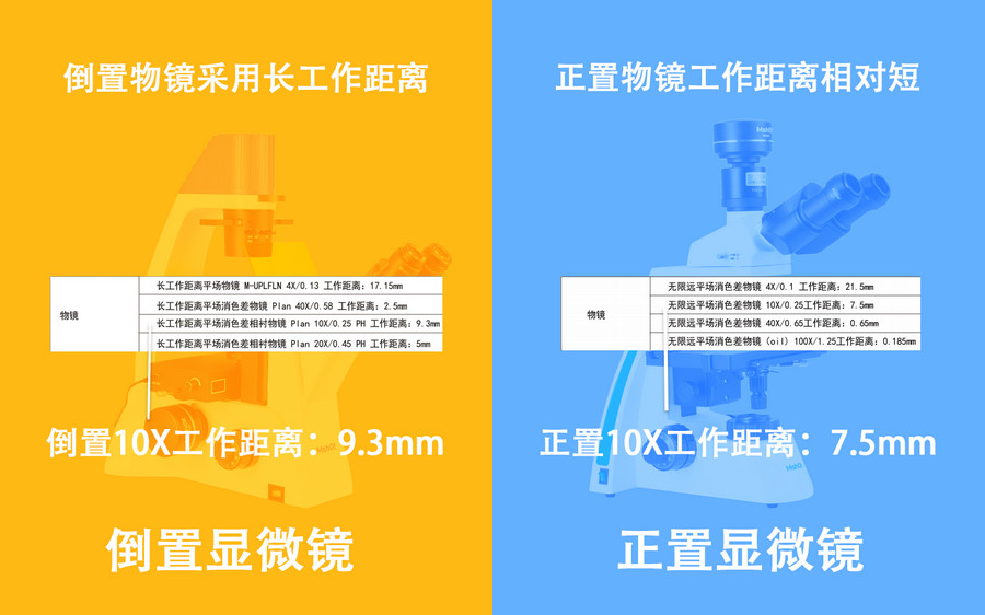 倒置顯微鏡通常用于觀察溶液中的被檢物,如培養(yǎng)液中的細(xì)胞,為了對(duì)焦溶液中的懸浮物,倒置顯微鏡的物鏡工作距離會(huì)比正置的大。