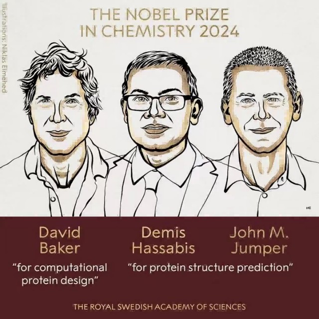 其中,一半獎(jiǎng)項(xiàng)授予了華盛頓大學(xué)的大衛(wèi)·貝克,以表彰他在蛋白質(zhì)設(shè)計(jì)領(lǐng)域的開創(chuàng)性貢獻(xiàn)。另一半則由谷歌旗下人工智能公司DeepMind的戴米斯·哈薩比斯和約翰·江珀共享,以表彰他們通過結(jié)合AI模型,在蛋白質(zhì)結(jié)構(gòu)預(yù)測(cè)中的非凡成就。