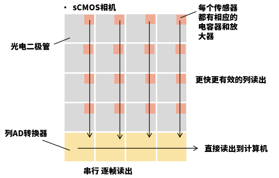 盡管CCD在顯微鏡中仍有其用途,但在大多數(shù)應(yīng)用場(chǎng)景下,CCD已被sCMOS系統(tǒng)取代。在CCD陣列中,每個(gè)像素的信息通過一個(gè)輸出節(jié)點(diǎn)、放大器和數(shù)字轉(zhuǎn)換器傳輸,而對(duì)于sCMOS相機(jī),像素是并行讀取的(圖5)。