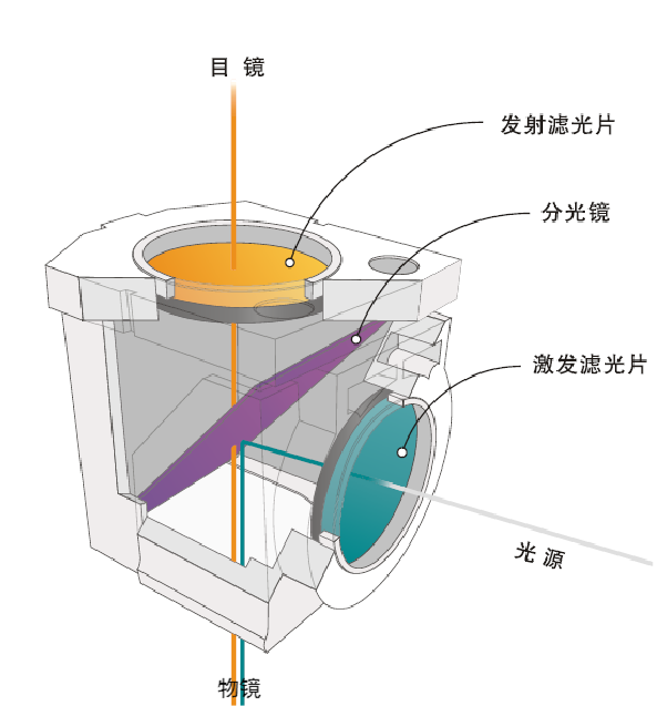 熒光激發(fā)塊由激發(fā)濾光片、二向分光鏡、發(fā)射濾光片組成。它們共同協(xié)作,確保只有特定波長(zhǎng)的光能夠通過(guò),從而獲得清晰的熒光圖像。
