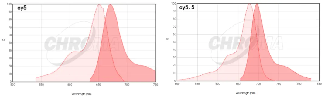 CY5和CY5.5是常用的生物分子標(biāo)記染料,廣泛應(yīng)用于熒光顯微成像、流式細(xì)胞儀分析和小動(dòng)物活體標(biāo)記成像。它們的激發(fā)和發(fā)射波長(zhǎng)位于近紅外區(qū)域,對(duì)濾光片的選擇要求極高。不恰當(dāng)?shù)臑V光片選擇可能導(dǎo)致熒光信號(hào)弱或無(wú)法捕獲。